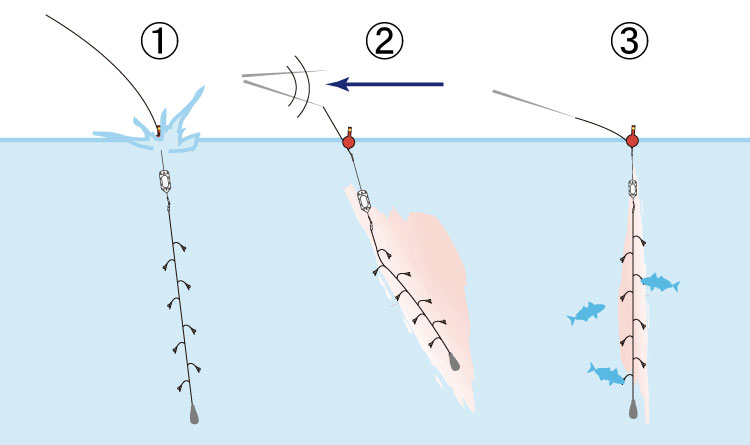 ① 채비를 먼 바다에 던져 넣습니다.
