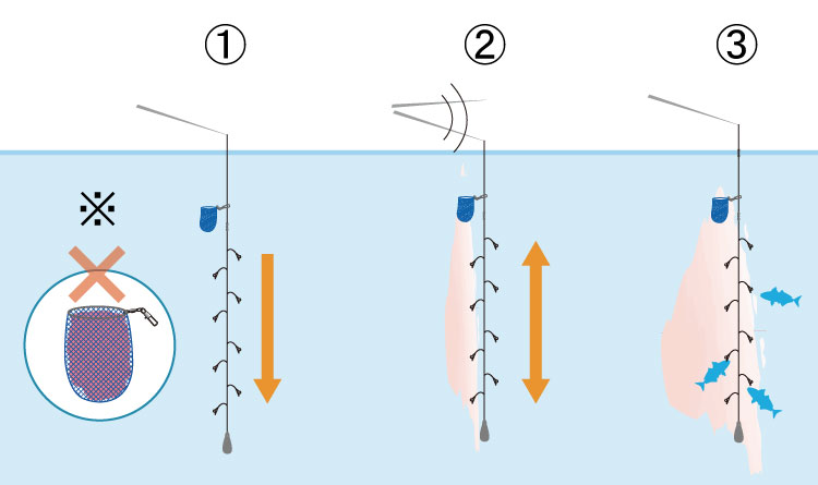 채비를 먼바다에 넣으면 로드를 크게 흔들어 밑밥을 흩뿌리고 입질을 기다립니다. 입질이 없으면 다시 로드를 흔들어 밑밥을 퍼뜨립니다. 입질이 없으면 채비를 회수하고 다시 던집니다.